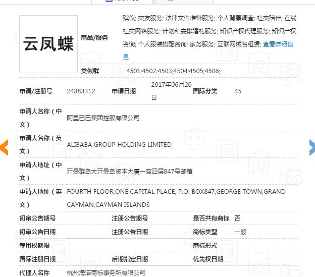 阿里作为互联网巨头,一举一动都可能让半个互联网圈震一震,大家也是密切关注阿里的动作。近日小编通过商标局查询到,阿里巴巴申请注册了众多商标,其中“云凤蝶”商标赫然在列。阿里巴巴在第九类电子电器、第十六类文具办公、第三十五类广告商业、第三十六类金融经济、第四十一类教育娱乐、第四十二类科技研究、第四十五类法律安全,分明申请注册“云凤蝶”商标??!