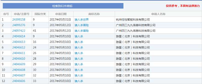 根据中国商标网的公开数据,目前申请含有“狼人杀”名称的相关商标申请共61件,数量可能还会不断增加,大部分商标均处于实质审核和异议过程。