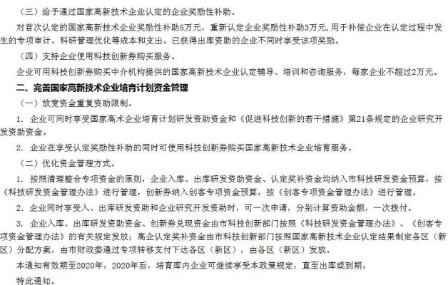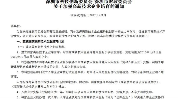 现在深圳市科创委和财政委联合出击,再度实施加强高新技术企业培育的新政策,助力企业认定国家高新技术企业展翅翱翔,深圳市对入库国家高新技术企业培育的企业(深圳市高新技术企业自动入库)给予最高300万研发资助、对入库期间认定为国家高新技术的出库企业给予最高300万研发资助,而且可以同时享受深圳市企业研究开发资助最高1000万资助资金,对首次认定的国家高新技术认定,深圳市奖励性补助5万元、重新认定补助3万元,企业家们,行动起来吧!