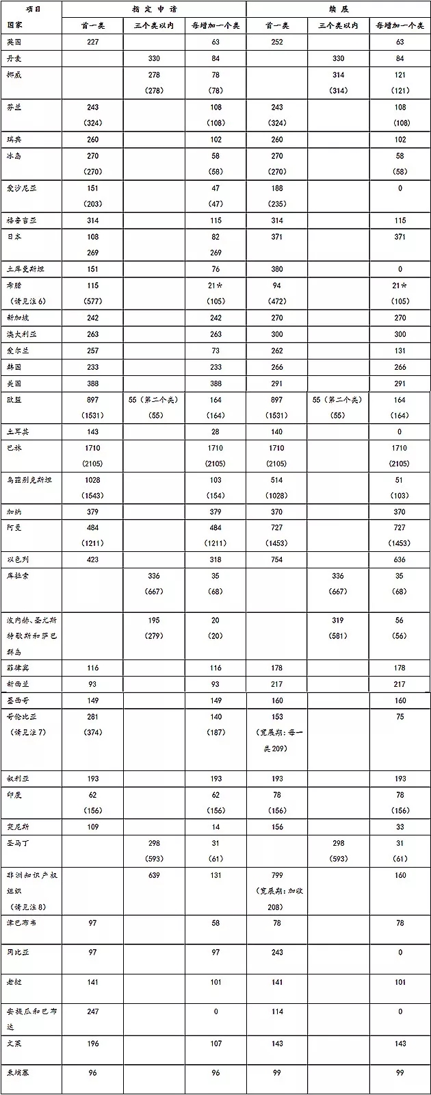 4.表上没有列的国家均为3个类别以内100瑞士法郎。